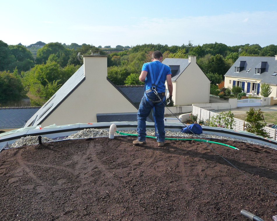 « Par la création d’un couvert végétal – complexe de végétalisation – après une étanchéité – complexe de d’étanchéité – la toiture végétale est composée de différents éléments techniques – drainage – filtre substrat – en vue de reconstituer le sol et son fonctionnement physique, chimique et biologique pour l’implantation de végétaux sélectionnés s’y adaptant, le tout durablement », avec un entretien incontournable.