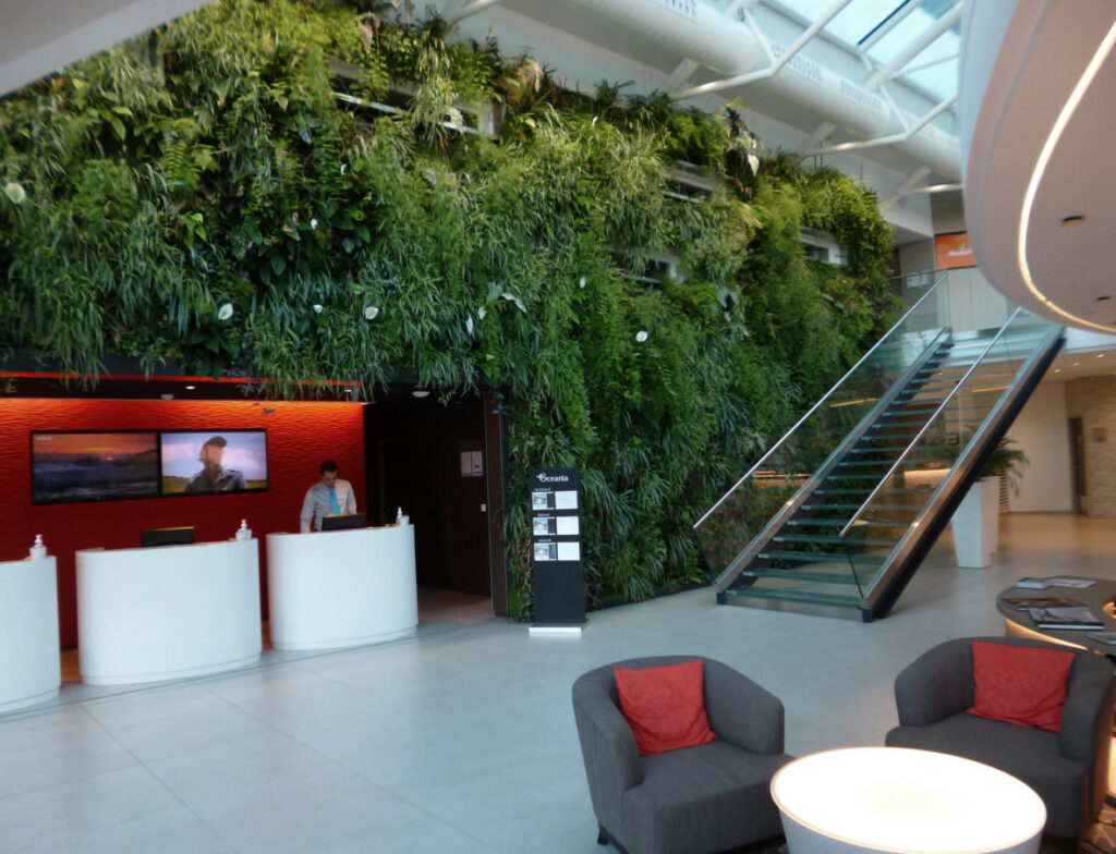 En intérieur, le mur végétal devient un marqueur fort : il transforme un hall d’accueil, adoucit l’acoustique d’un open space, ou crée une respiration végétale dans un espace de détente. Chaque réalisation est pensée pour dialoguer avec l’architecture et renforcer le bien-être des usagers.