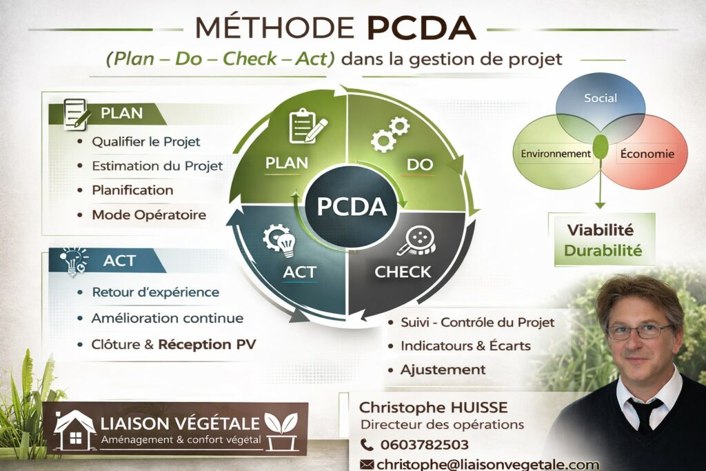 La méthode de gestion PDCA (Plan – Do – Check – Act) est au cœur de l’approche de Liaison Végétale. Inspirée des principes d’amélioration continue, elle garantit des projets solides, qualitatifs et adaptés aux besoins réels de chaque client.